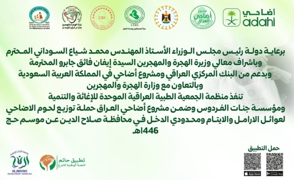 توزيع 3800 حصة من لحوم الاغنام على المشمولين في سامراء في الجانب الانساني ودعما للطبقات المعوزة والفقيرة في سامراء قامت الجمعية العراقية بالتعاون مع منظمة جنات الفردوس بتوزيع ثلاثة الاف وثمانمئة حصة من لحوم الاغنام شملت ذوي الاحتياجات الخاصة والعائدين من النزوح وعوائل الايتام والارامل وعوائل العاملين في البلدية وعبر المواطنون عن شكرهم وتقديرهم لهذه المبادرة التي عكست تكافلا مجتمعيا للعوائل المحتاجة.
